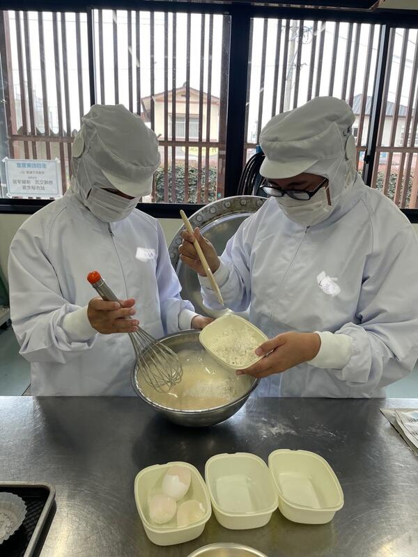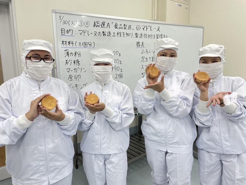 昨日3、4限目に他学科の生徒が食品製造を学ぶ総選Aの授業が行われ、初めて実習服に着替えてマドレーヌ製造実習を行いました受講者は、生活経営科と普通科福祉コースの生徒ですが日頃より調理実習や福祉実習に取り組んでいるため食品科学科の生徒と変わらない手際の良さ、チームワークの良さでマドレーヌを製造しました