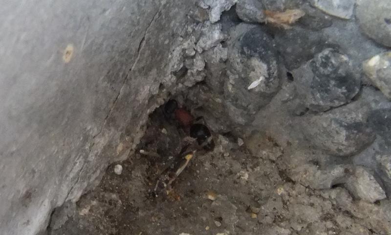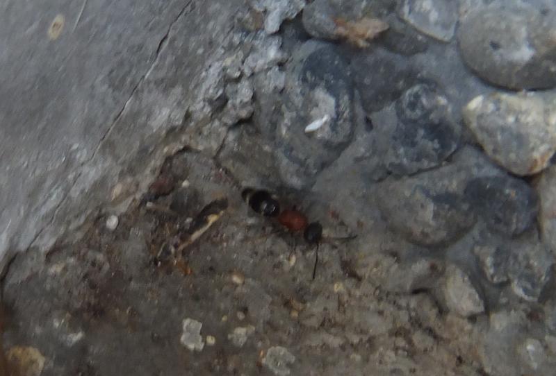 6月9日、校内に珍しいアリがいるなと思い調べてみるとムネアカアリバチでした。胸部が赤色で、頭部と腹部は黒色。腹部に白い帯がありました。