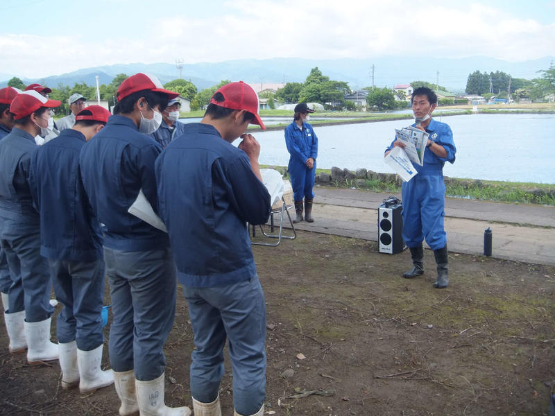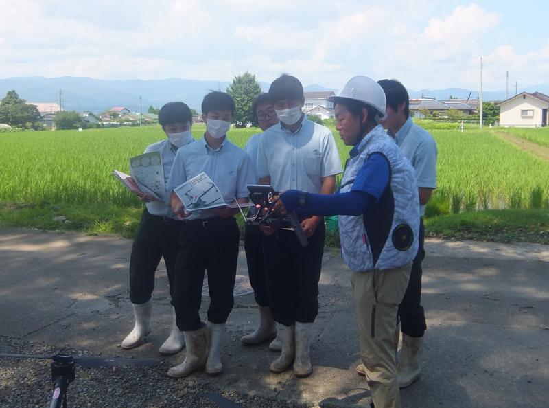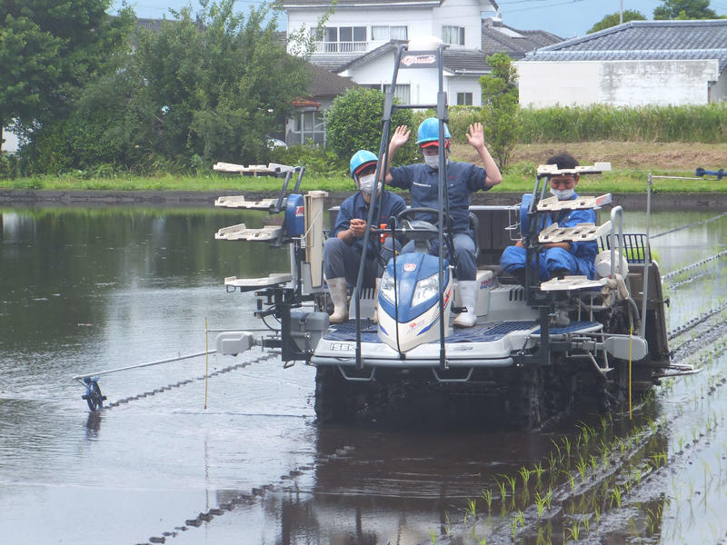 6月19日、球磨農業研究所でスマート農業に係わる水稲密苗栽培(田植え)実演会が行われ、本校からも就農塾生や2年総合農業科植物コースの生徒たちが参加しました。