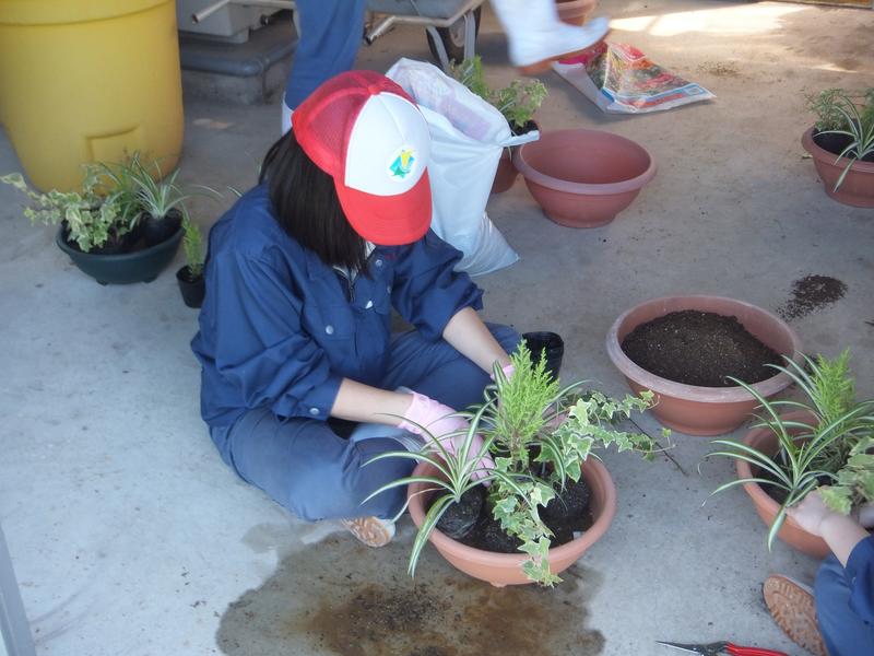 6月16日、総合農業科3年生の草花コースの生徒たちが観葉植物の寄せ植えづくりに取組んでいました。秋以降になる熊本空港への装飾準備です。農業は、数ヶ月や数年先を見越して取組む仕事です。これから製作した寄せ植えの管理が始まります。