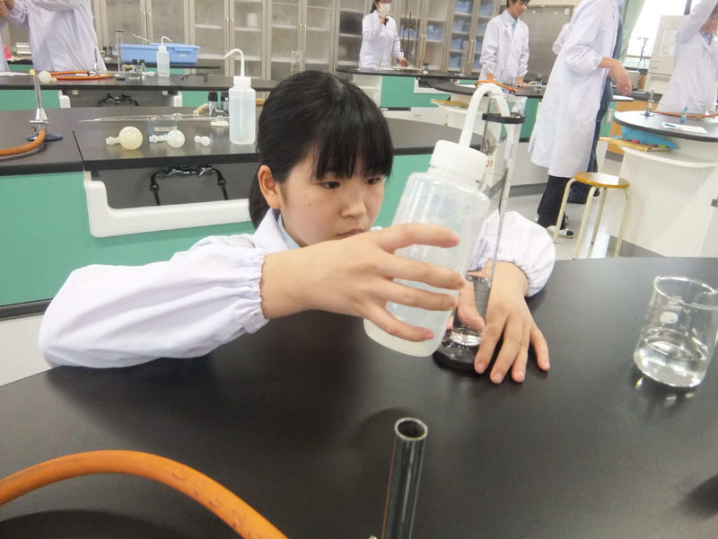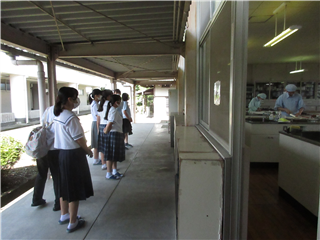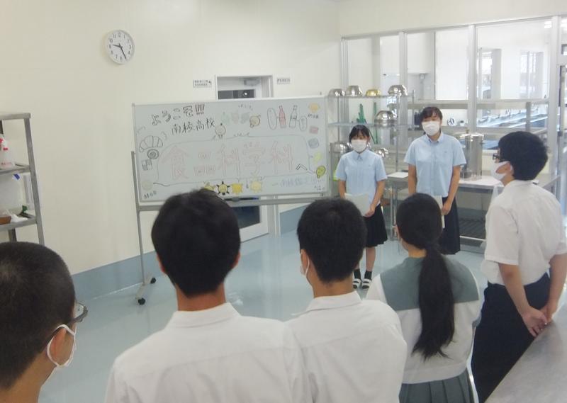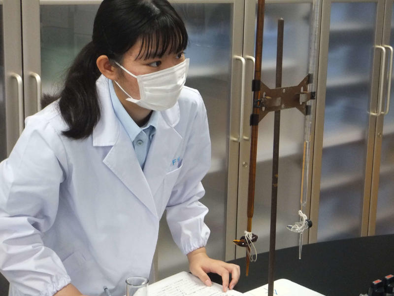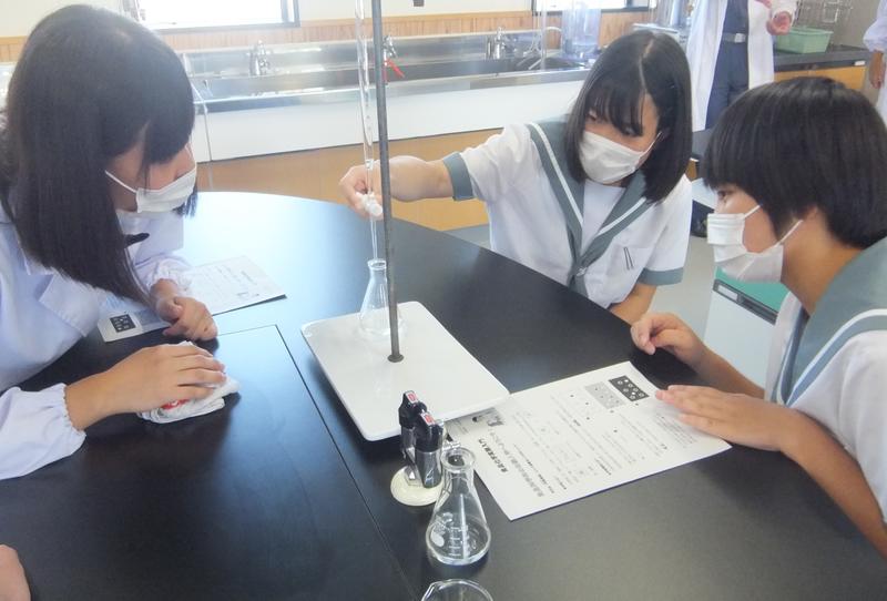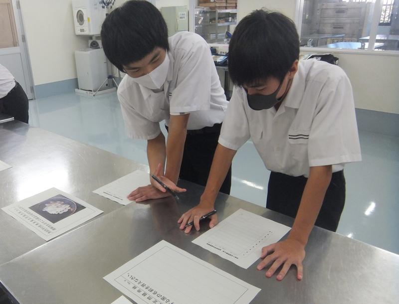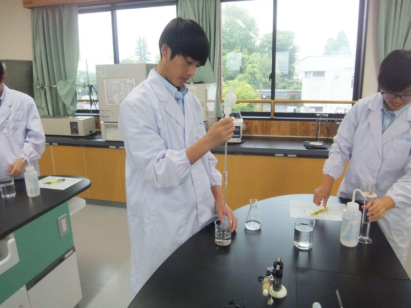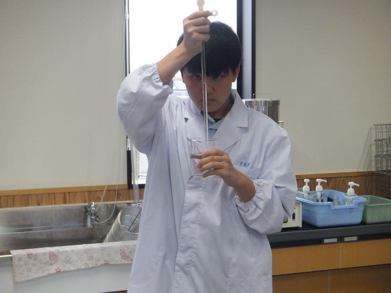 6月18日、2年食品科学科の生徒たちは食品化学と食品製造の2グループに分かれての授業でした。食品化学の授業では食品化学実験の基礎の復習に取組んでいました。メスシリンダーやピペット類、ガスバーナーなどの操作方法を真剣に振り返っていました。