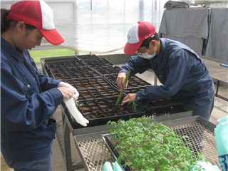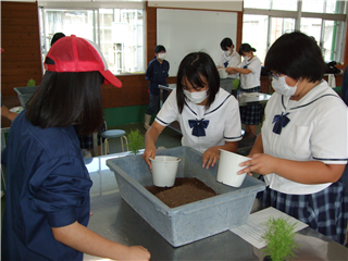 農業クラブ総務役員の3年生が雨に打たれながらも、元気良く植え付けを行ってくれました!