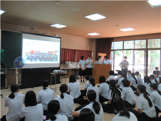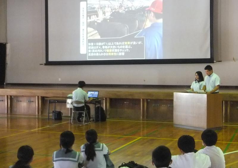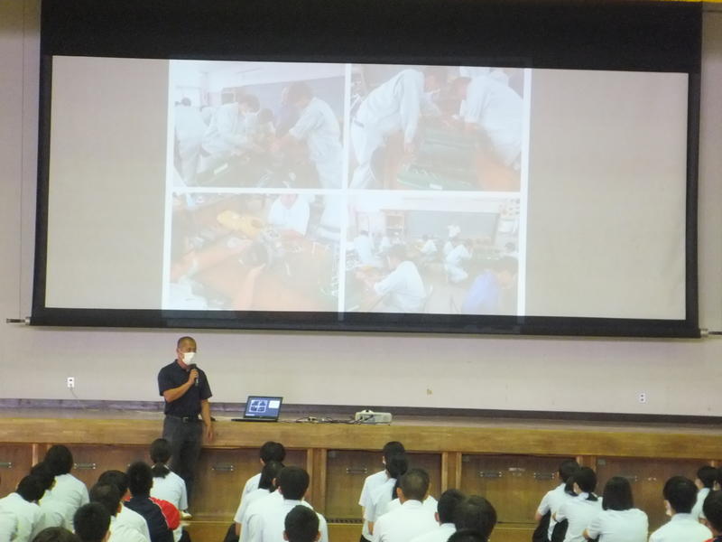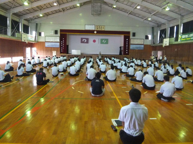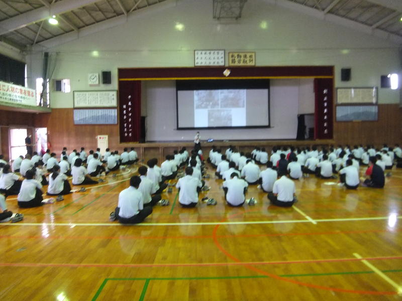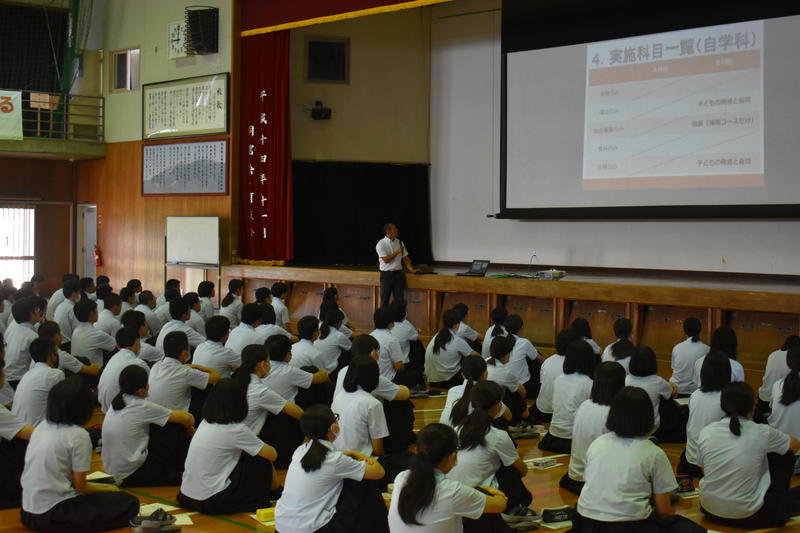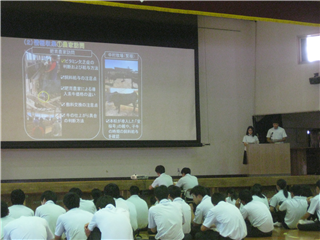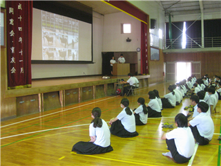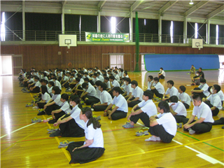 3年生の講師の話にしっかりと耳を傾ける1年生
