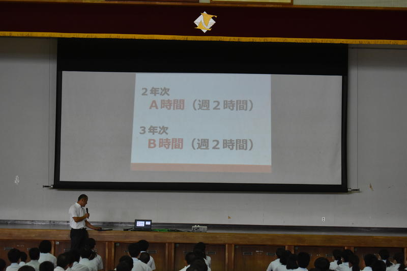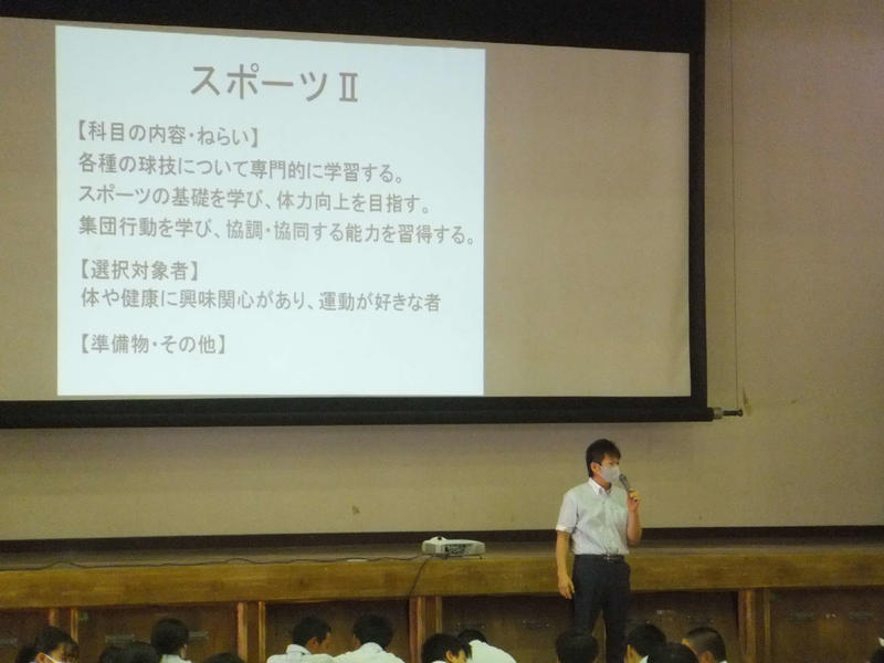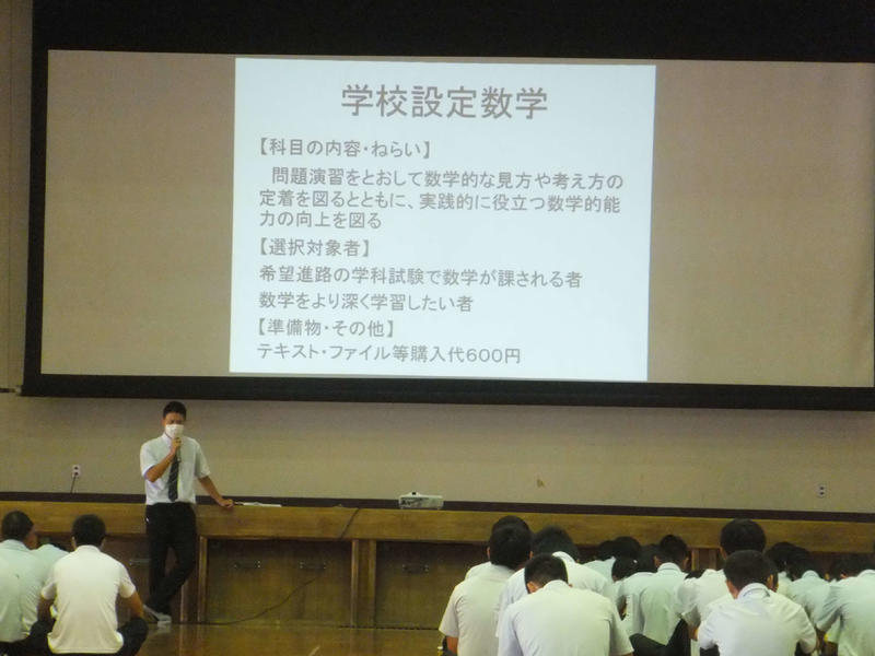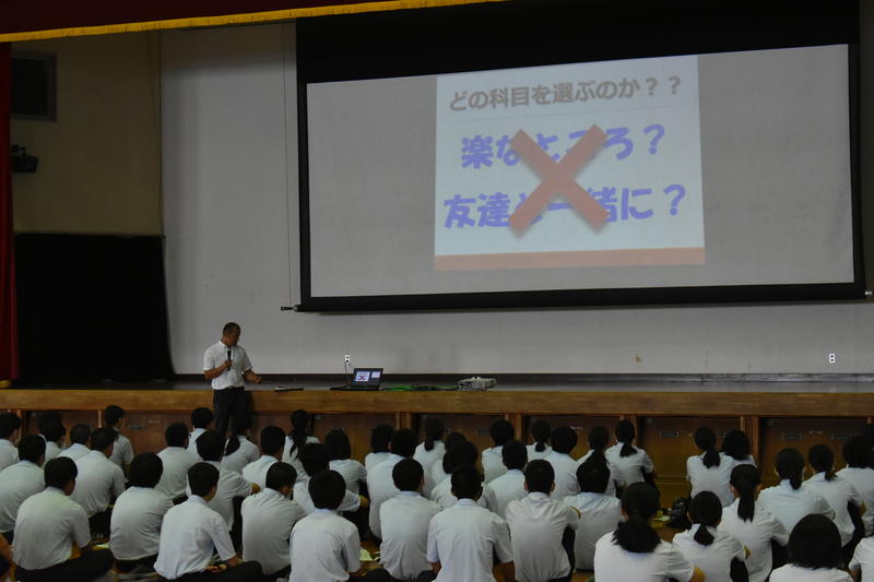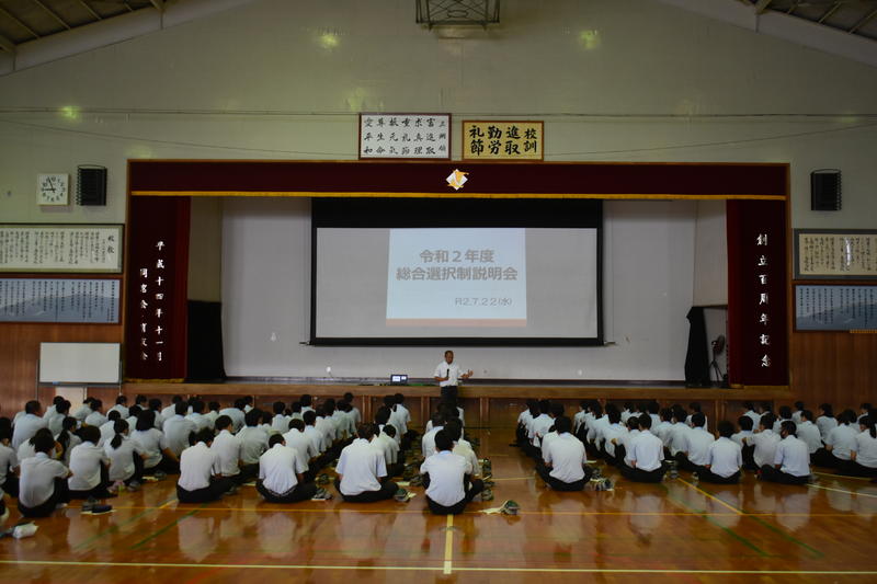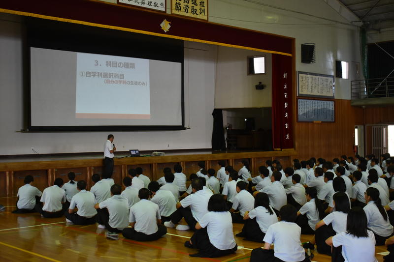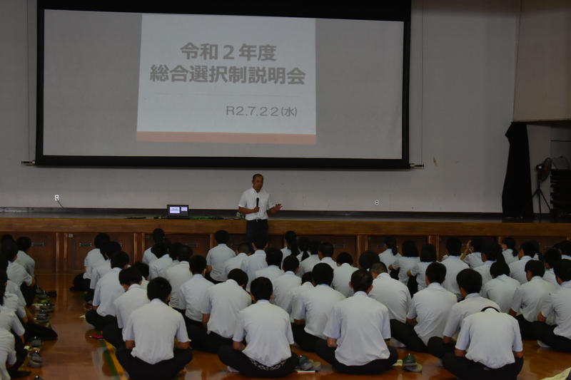 9月9日、1年生に対し総合選択制の説明会が行われました。2年次で選択する科目を真剣に考えている様子が見られました。説明会後も、担任の先生などに自身の進路と選択科目について相談する姿も見られました。