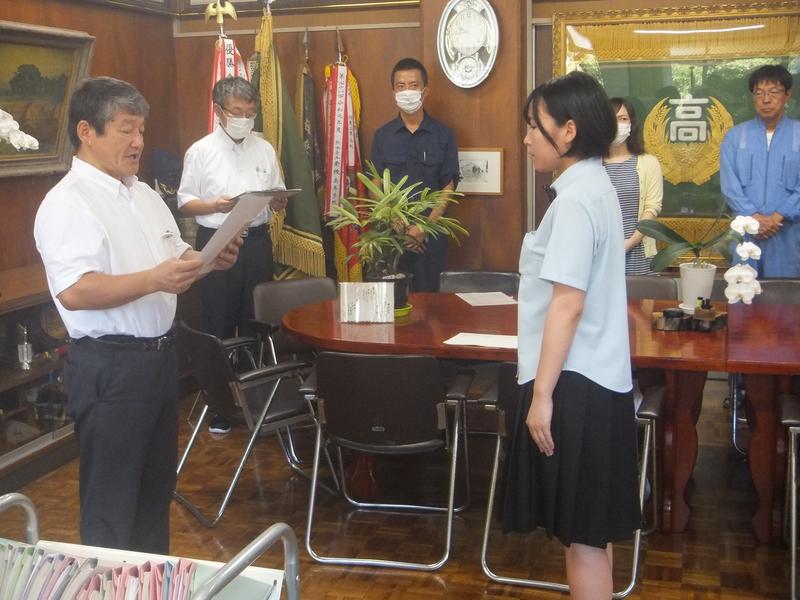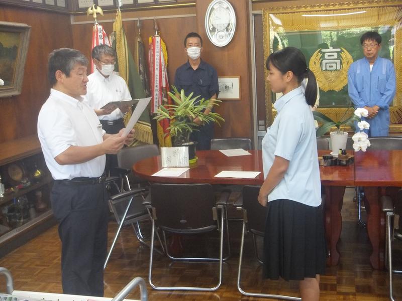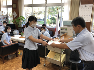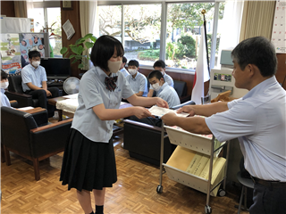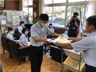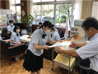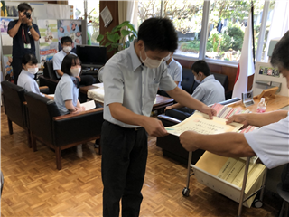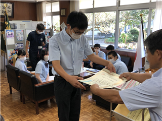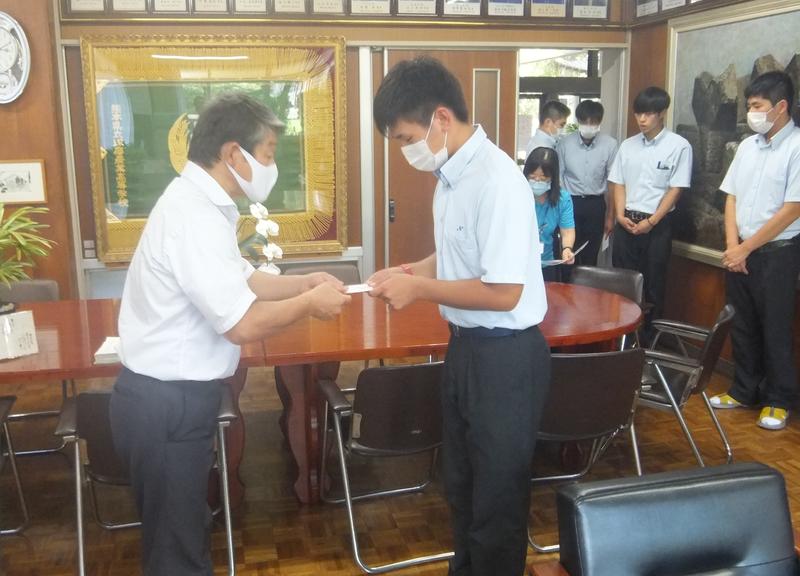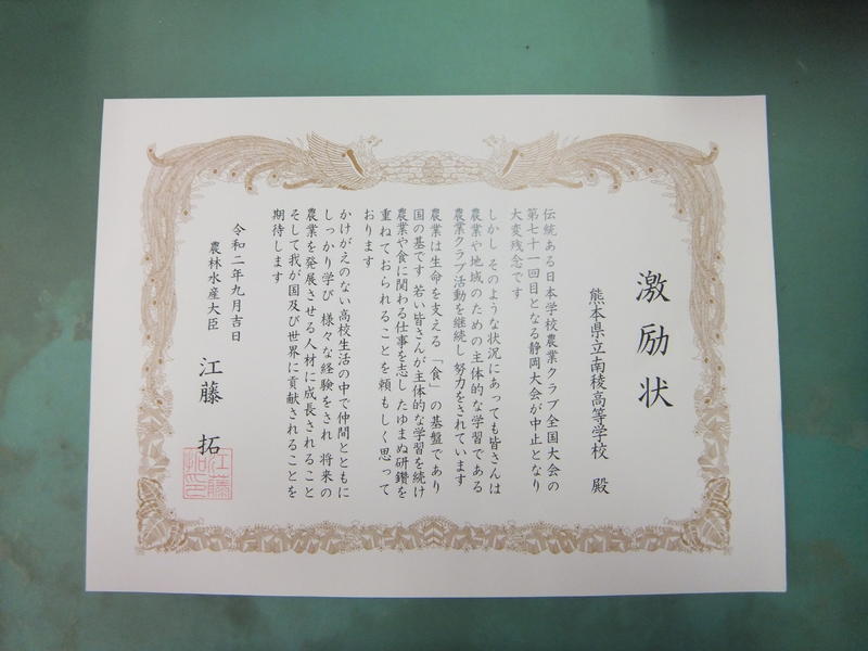 9月11日、九州農政局から3名の方が来校され、江藤農林水産大臣からの激励状を代表生徒に手渡していただきました。この激励状は学校農業クラブの全国大会や九州大会が新型コロナウイルスの影響で中止となったことに対し、全国の生徒を激励するために江藤農林水産大臣から贈られたものです。贈呈式には農業クラブ役員や先日の年次大会等で最優秀賞に輝いた生徒たちが参加し激励状を受け取りました。大臣からの励ましを胸に、コロナに負けずしっかりと前を向いて活動していきたいと思います。