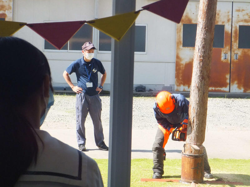 本校環境コースの生徒も演習林におけるスギやヒノキの間伐実習に取り組むことから、ほぼ全員が2年次の夏休みに特別教育を修了しています。