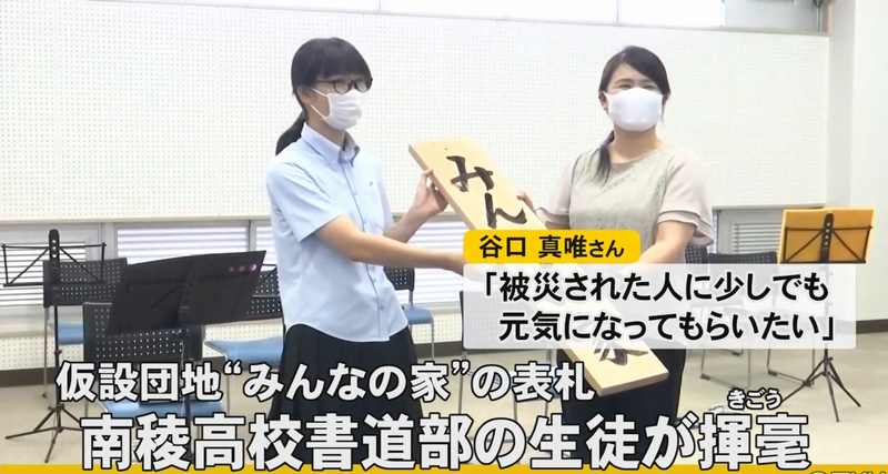 8月29日、TKUテレビ熊本で、書道部の生徒が、今回の豪雨災害で建設された仮設団地の表札を書いている様子が放映されました。