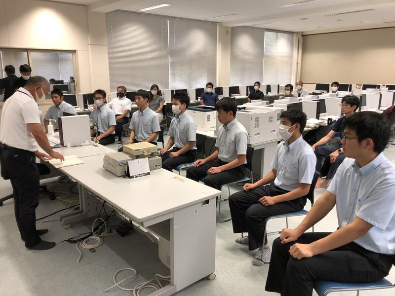 暑い中での研修でしたが、生徒たちはこれまで操作したことのない機械に興味津々でした取得した資格を活かして、卒業後、技術者としての活躍を願っています
