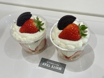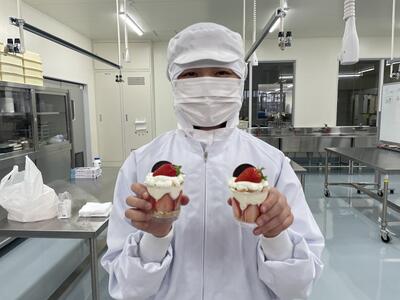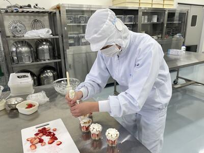 牛乳や乳製品と果物を使った「レアチーズケーキミニパフェ」を試作し、食品科学科の先生方に試食して