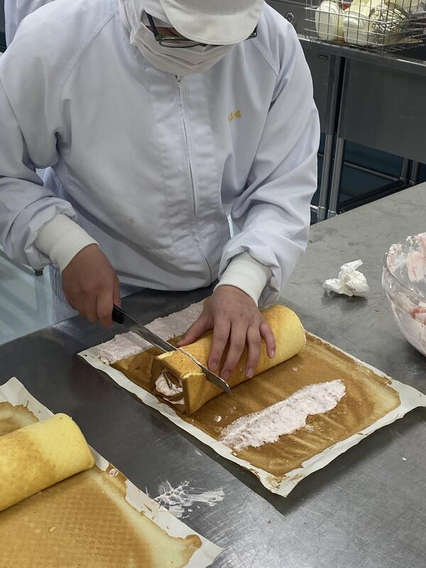 Day 2, students made strawberry jam. First, they learned about kitchen hygiene and food safety management. They made really good ones and they used them for the cream of the cake rolls. They listened carefully to understand what the teacher said because it was their first time, they didn't want to mess up. They struggled a little bit when they rolled the cake, but they did it! We were really happy to share this time with the students