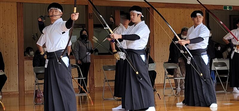 選手たちは「必ず勝つ」と落ち着いた表情で1本競射(一人1本ずつ引いて、3人の合計で勝敗を決める)に臨み、2対1で戦いを制し、準優勝を勝ち取りました。(男子団体出場52チーム)