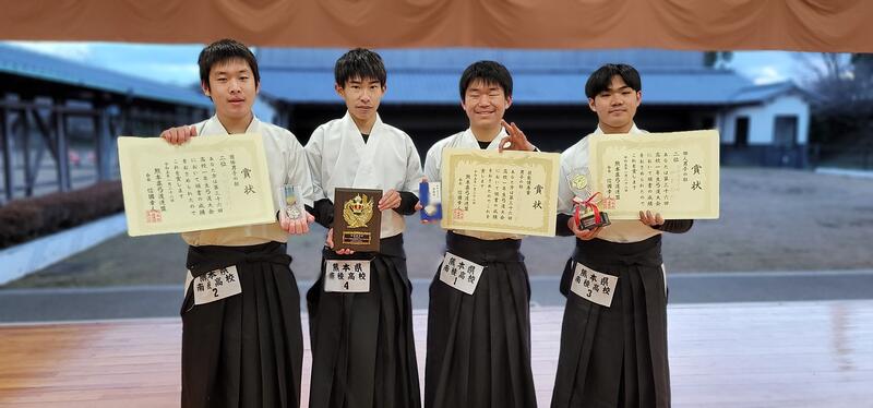 表彰式で団体準優勝、個人準優勝の表彰を受けたあと、南稜高校の名前がもう一度呼ばれ、思いがけず男女1校のみが選ばれる「技能優秀校(男子の部)」をいただきました。弓道は的中のみならず、弓を射る姿や体配(立ち居振るまい)、礼儀が重んじられる競技です。技能優秀校の受賞は、的中での表彰を上回る喜びとなりました。
