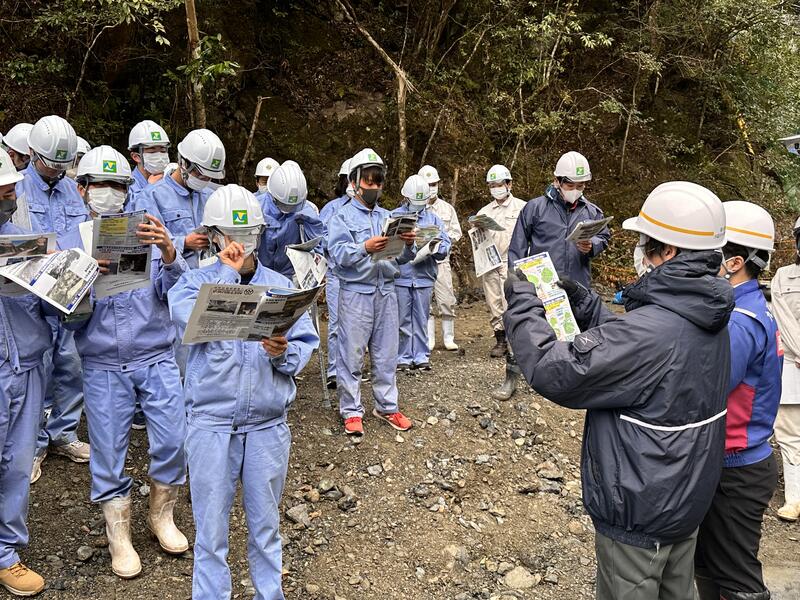 その後、マイクロバスで五木村へ行き、小川第2砂防堰堤工事現場を視察しました。国土交通省の方と施工を担当されている三和建設株式会社の方から説明を受け、コンクリートを打設しているところを見学しました