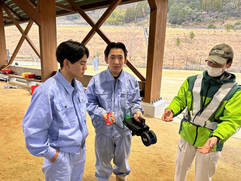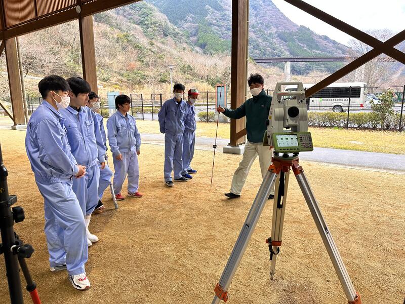 午前中は、南稜高校で建設業についての講義、五木村五木小川第2砂防堰堤工事現場視察。午後からは、流水型川辺川ダムの説明、ICTバックホーの説明、操縦体験。ICT技術を用いた測量機器の説明、操作体験が行われました