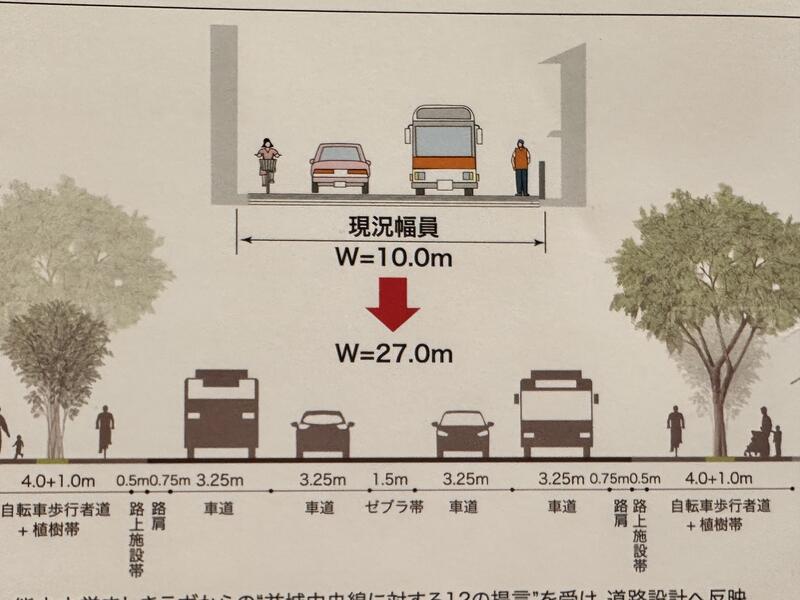 午前中は、益城町4車線化工事現場を視察しました。この工事は元々道路の幅員が10mあるものを27mに広げて、そこに自転車道、歩行者道、植樹帯等を設置するという工事でした。この道路は、地域住民、行政、大学の先生方が話し合いを重ねて、熊本地震からの創造的復興のシンボルとなるまちづくりの一環として行われているそうです