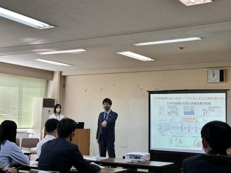 南稜高校で行われた建設業についての講義では、国土交通省の方が、公務員の仕事について、味岡建設株式会社の方が施工会社の仕事について、株式会社九州開発エンジニアリングの方が、コンサルタントの仕事について分かりやすく説明してくださりました