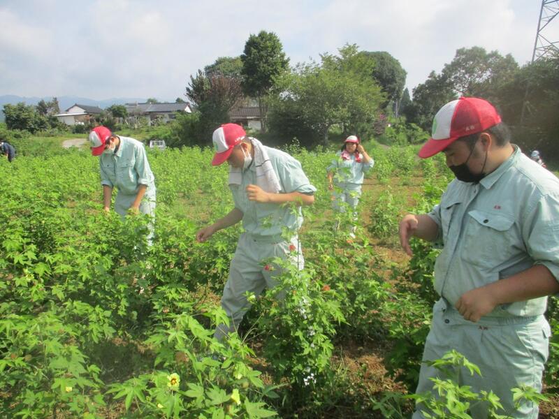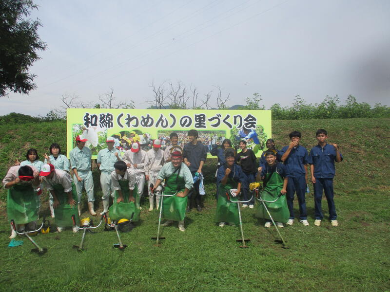 人吉高校、球磨工業高校、球磨中央高校、南稜高校で連携して取り組んでいる和綿の里づくりの一環として、あさぎり町須恵の和綿畑の草刈り、芯止めに総合農業科植物コース、男子バレー部の有志が参加しました。