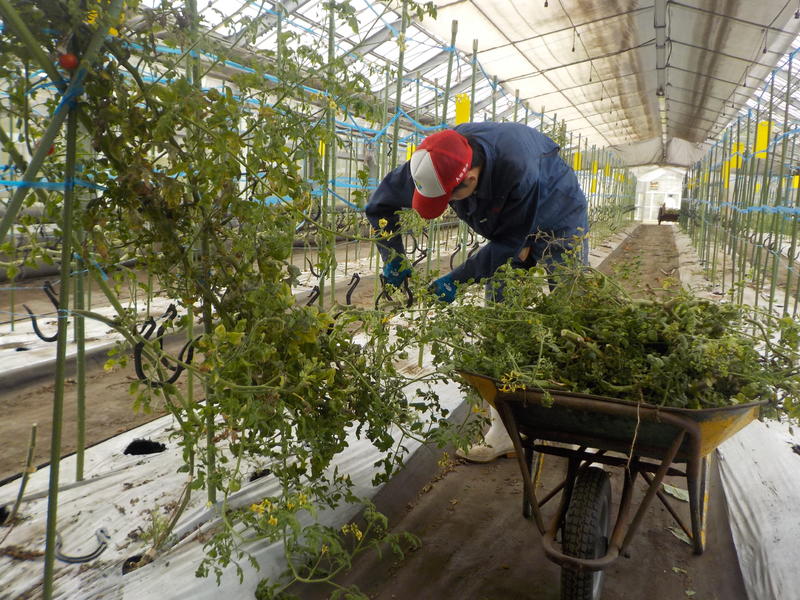 総合農業科「野菜」の農場実習です。トマト温室の片付け、片付け後は次の作付け準備です。