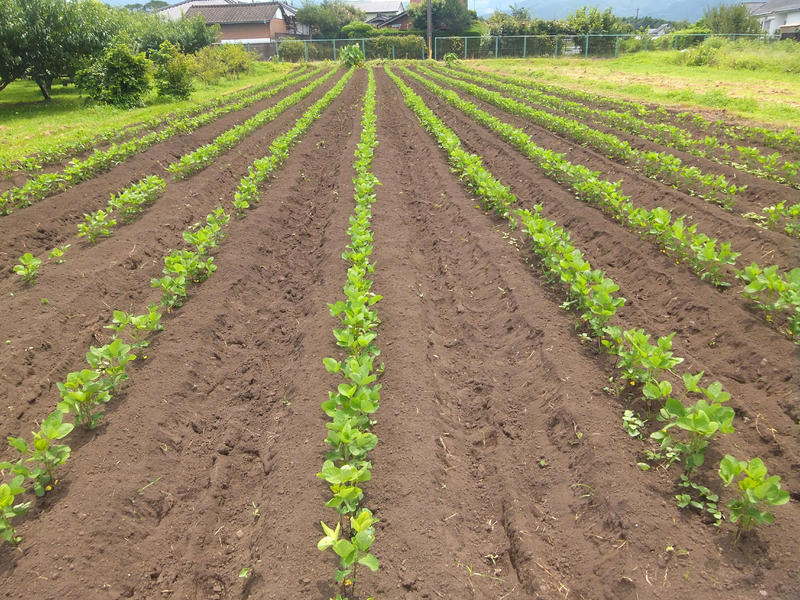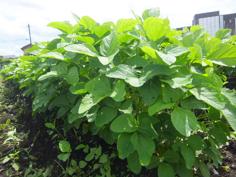 7月18日に総合農業科2年植物コースで播種した、ダイズ100粒運動(ジュニアとうふマイスター認定講座)のダイズが夏の日差しを浴びながらすくすくと成長しています。
