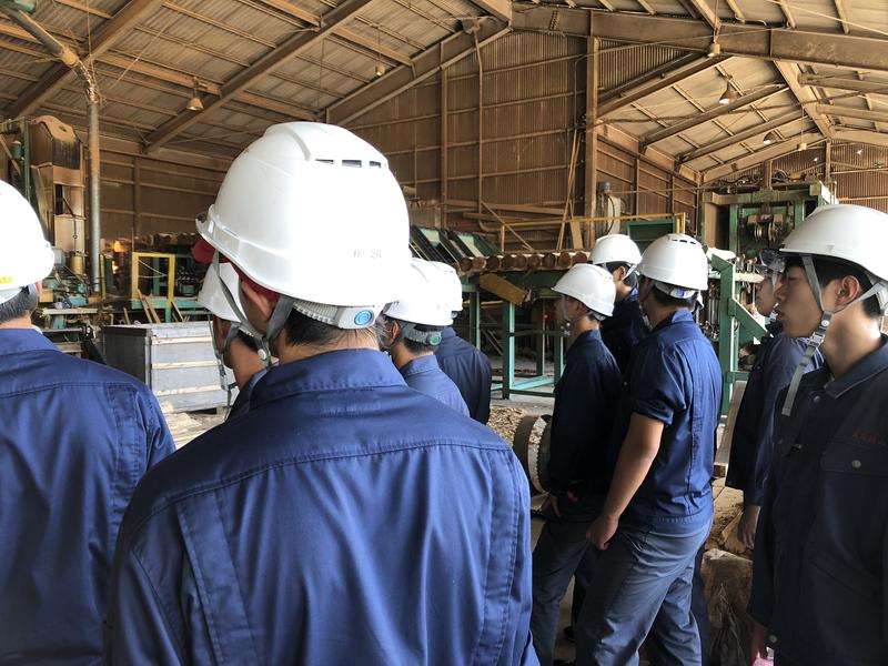 大型の木材加工機械に見入っています!~多良木町森林組合製材工場~