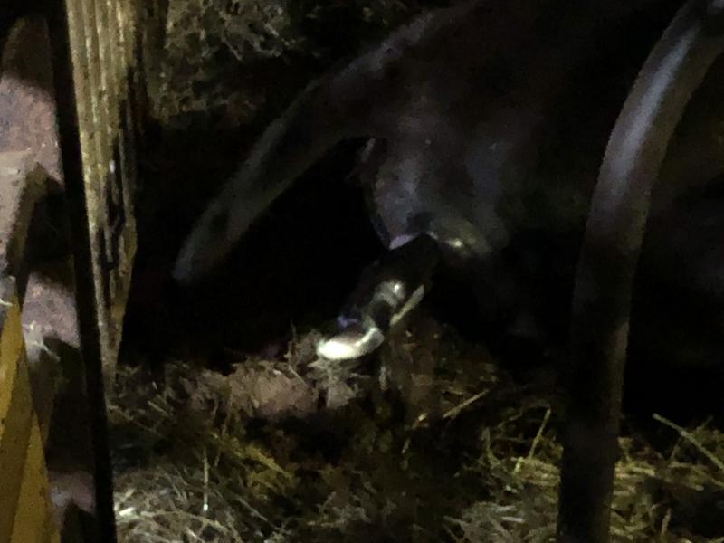 足胞が出ました。2次破水です。羊膜に包まれた子牛が出てきました。繁殖牛は立ったり座ったりしながら子宮の中の子牛の体勢を整え、産道に誘導します。