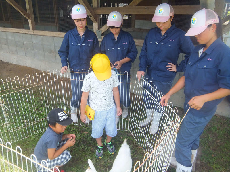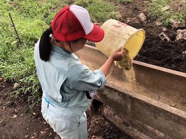 電気牧柵の下は草を切ります。草が伸びて電気牧柵に触れると漏電の原因になります。3年生になると草刈りの技術は格段に高まります。