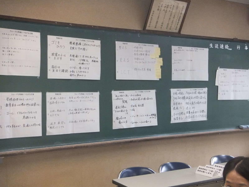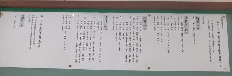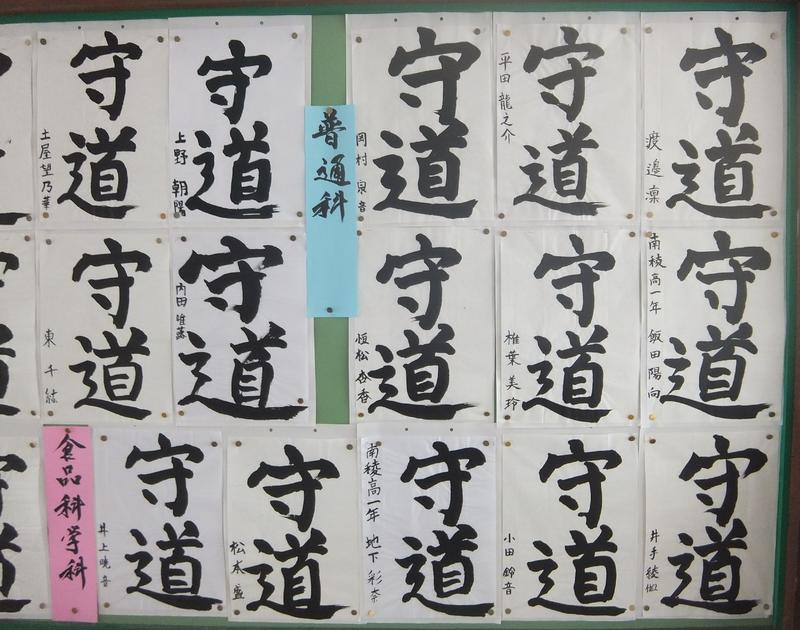書道室の前に書道の時間に書き上げた生徒の作品が展示してあります。