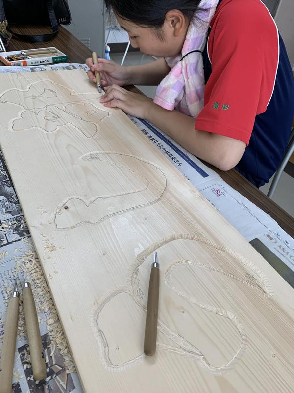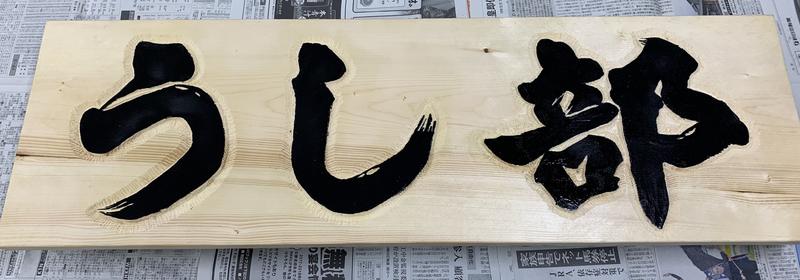 文字の練習、板への転写、文字周りを彫刻刀で彫り進め、文字を塗る作業、ニス塗り。