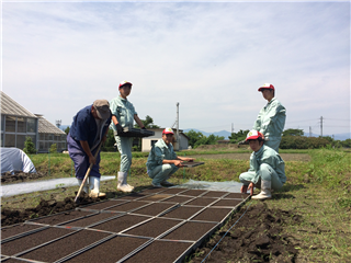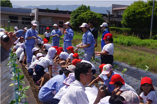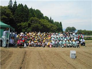 厳しい日差しのもと、畑に1列に並んで、みんなで力を合わせて頑張りました。