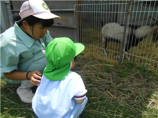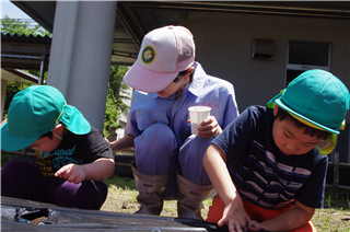 ~紙芝居で種まきの方法を伝授~ ~夢中になっている子どもの背中に手を添える、五月晴れの午後~