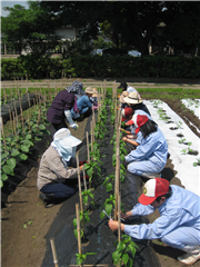 5月22日(金)、聴講生の方々とピーマンやナスの誘引をしました。「♪だあれが生徒か、先生か・・・」みんなで楽しくできました。収穫が楽しみです。