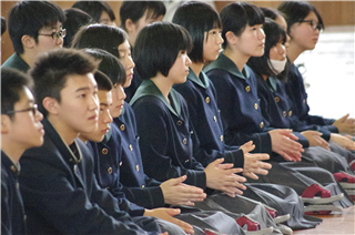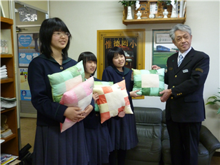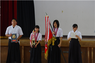 写真は、全国103校を代表して、工業所有権情報・研修館(INPIT)三木理事長から、紫藤校長へ「採択決定書」を授与。