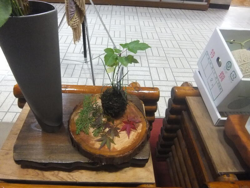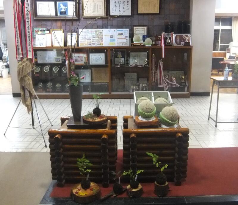 正面玄関に飾られていたサツマイモからメロンにバトンタッチされました。立派なメロンです。よく見ると「笑顔」の文字が。また、一緒にコケ玉と生け花も飾られています。南稜らしい異風景。南稜あるあるですね。