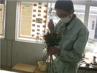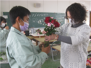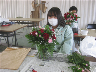 本日11月16日(火)支援事業「ものづくりマイスター」プロジェクトを活用し、フラワーアレンジメント講習会を開催しました。第1部の技術講習会は花束。国家検定1級技能士立岡淳子先生のご指導の下、作成しました。