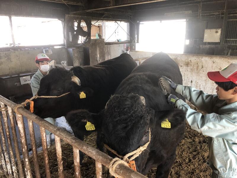 今回は肉用牛のブラッシング。ブラッシングの目的はウシの体を清潔にしたり、人とのコミュニケーションを図ったりといくつか目的があります。今回はそれに加えて、「子牛→肥育前期→肥育後期と体がどう変化するかを学ぶ」ことをテーマに取り組みました。