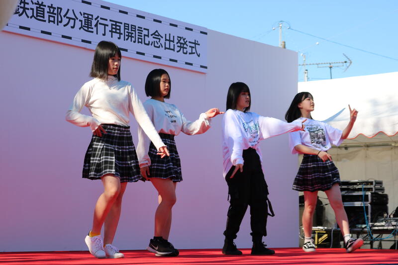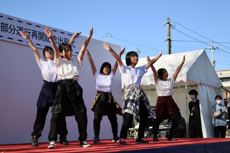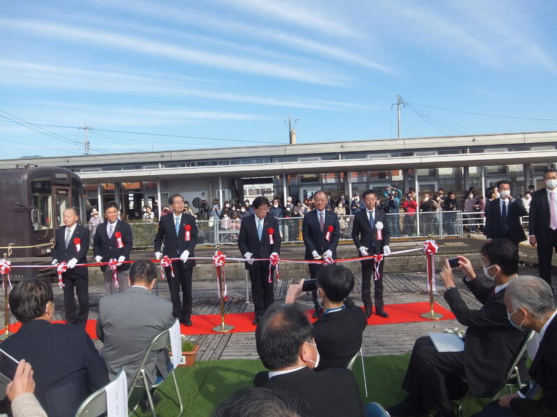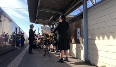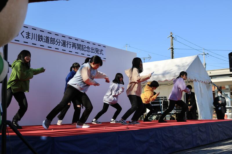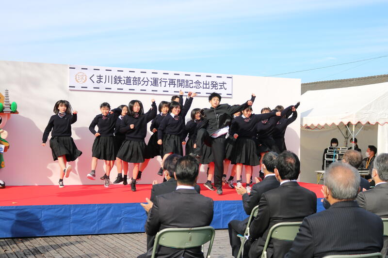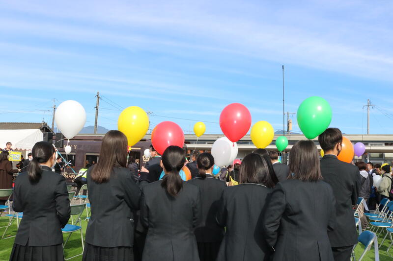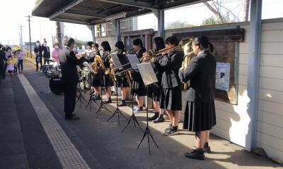 吹奏楽部は、11月28日(日)のくま川鉄道の部分開通日に、あさぎり駅ホームで演奏して列車のお出迎えを行いました。