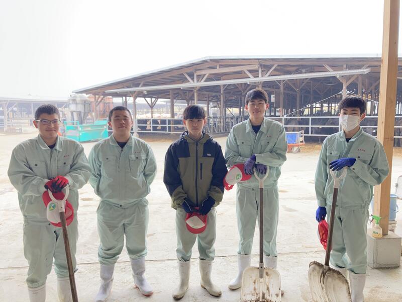 有田牧場様で研修している5名です大規模な牧場では、機械化やマニュアル化など作業効率化が進んでおり、その技術の高さに驚きの連続とのことです。