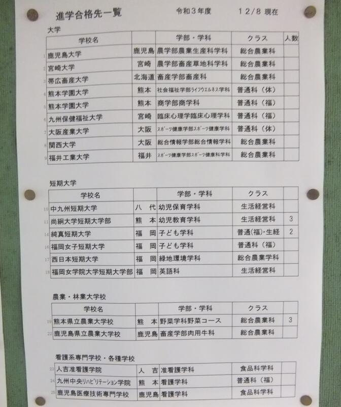 令和4年度 鹿児島大学入学者選抜の結果が12月1日(水)に発表されました。本校総合農業科3年生が農学部農業生産科学科に合格しました。日頃から進学に向けて勉学に励み、多くの活動から得たことが実りました。