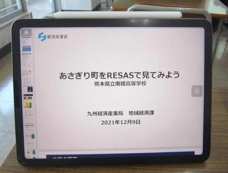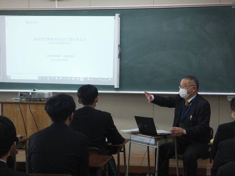 12月9日(木)、総合選択Bの「政治経済」の授業において経済産業省九州経済産業局から須藤様、秋本様におこしいただきRESAS(リーサス)の活用について学習させていただきました。「あさぎり町をRESASで見てみよう」をテーマに、分かりやすく、そしてRESASを身近に感じることができるように教えていただきました。