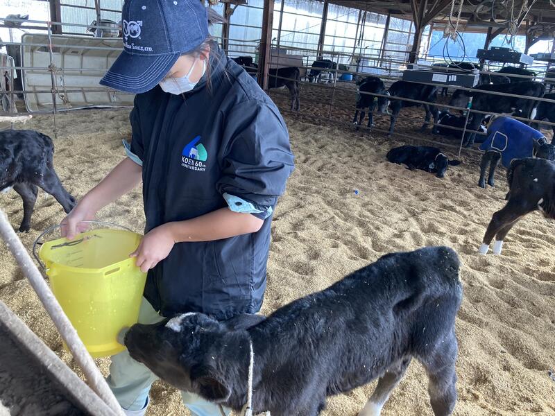 (有)オオツボ様では、産まれてまもない子牛にミルクをあげていました。現場実習も終盤となれば、慣れた手つきでミルク作りができるようになったようです