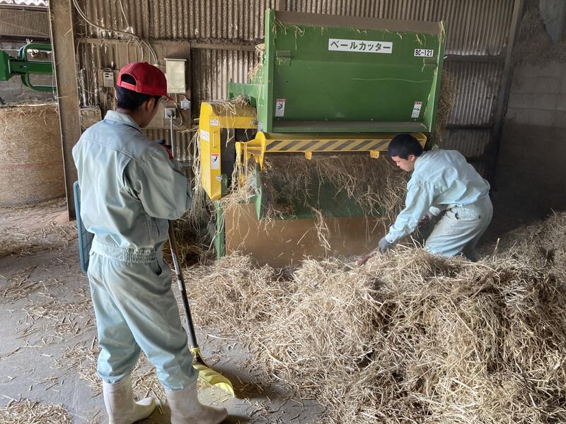 藤原牧場様では、ベールカッターで裁断されたワラをまとめる作業を行っていました。「貴重な経験ができて楽しいです 」との感想が聞けました。専門の学びが深まっているようです。