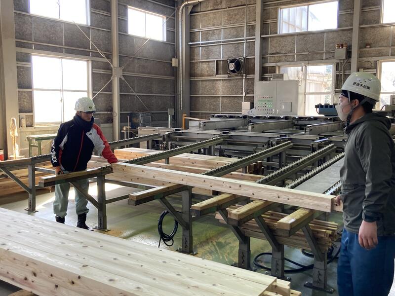 (株)肥後木材様では、新築用の構造材をプレカットした製品の検品を行っていました。扱ったことのない高精度な機械を操作したり、家ができる工程を学んだりと知識を深めました御担当の方から「よく頑張ってくれます