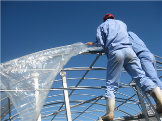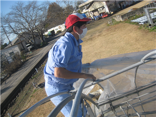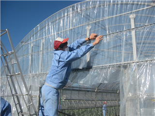 最近は天気も良く、昼間は暑いぐらいです。そんな中、霧も晴れビニールハウスの天井ビニールを展帳しました。