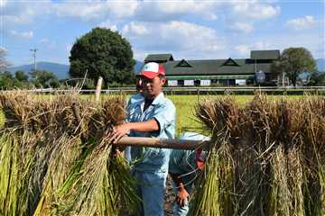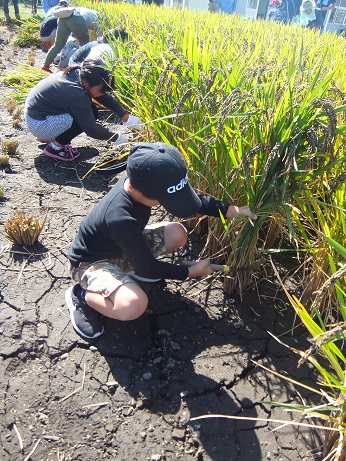 本校作物専攻が育てている稲、約100年前の品種を鎌で刈り取っていく実習体験です。