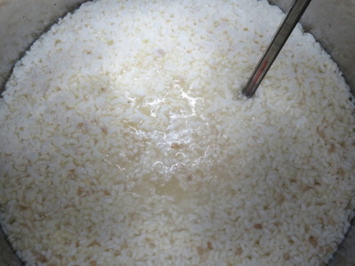 ↑鬼皮をむいたところ。大きい! ↑重曹を加えてゆで、アクを取ります。