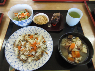 【献立】山菜おこわ、つぼん汁、切り干し大根の酢の物、