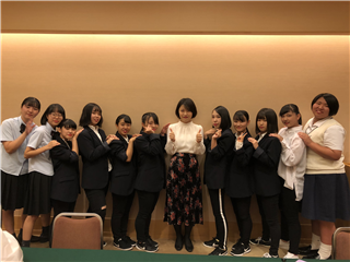 部員14名全員で舞台に上がり、多くの声援をいただきました。