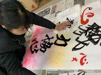 書道部員も代わるがわる曲に合わせてサビの部分の歌詞をボードに貼り付けられた用紙に揮毫していき、