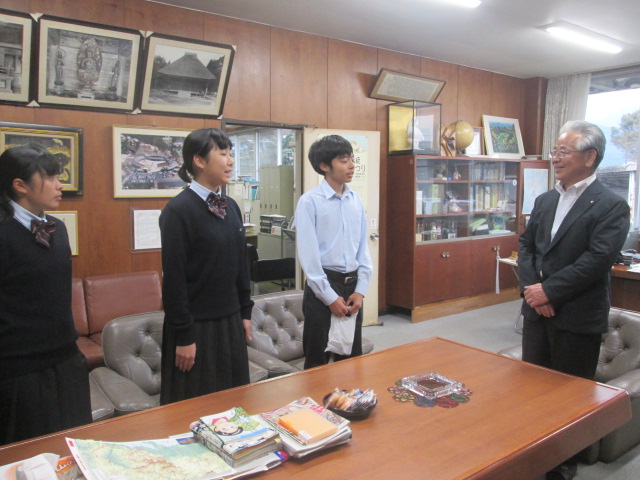 10月11日(木)海外インターンシップ研修に参加した3名が、鶴田同窓会長へ報告に行きました。2年総合農業科の元田さん、酒井君、2年食品科学科の今村さんの3名です。