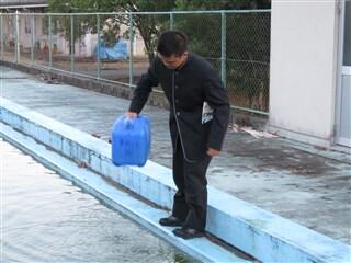 その後、南稜高等学校に戻りました。南稜高等学校のプールは小学校のプールに比べると大きく、ポリ容器2缶分のEM菌を散布しました。